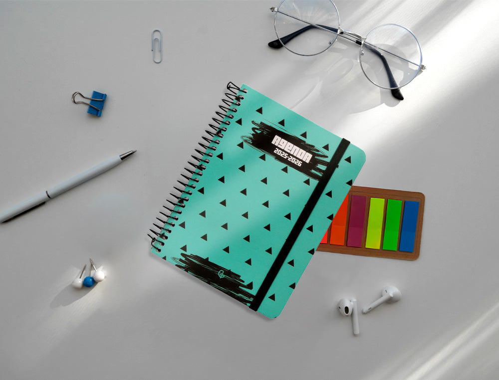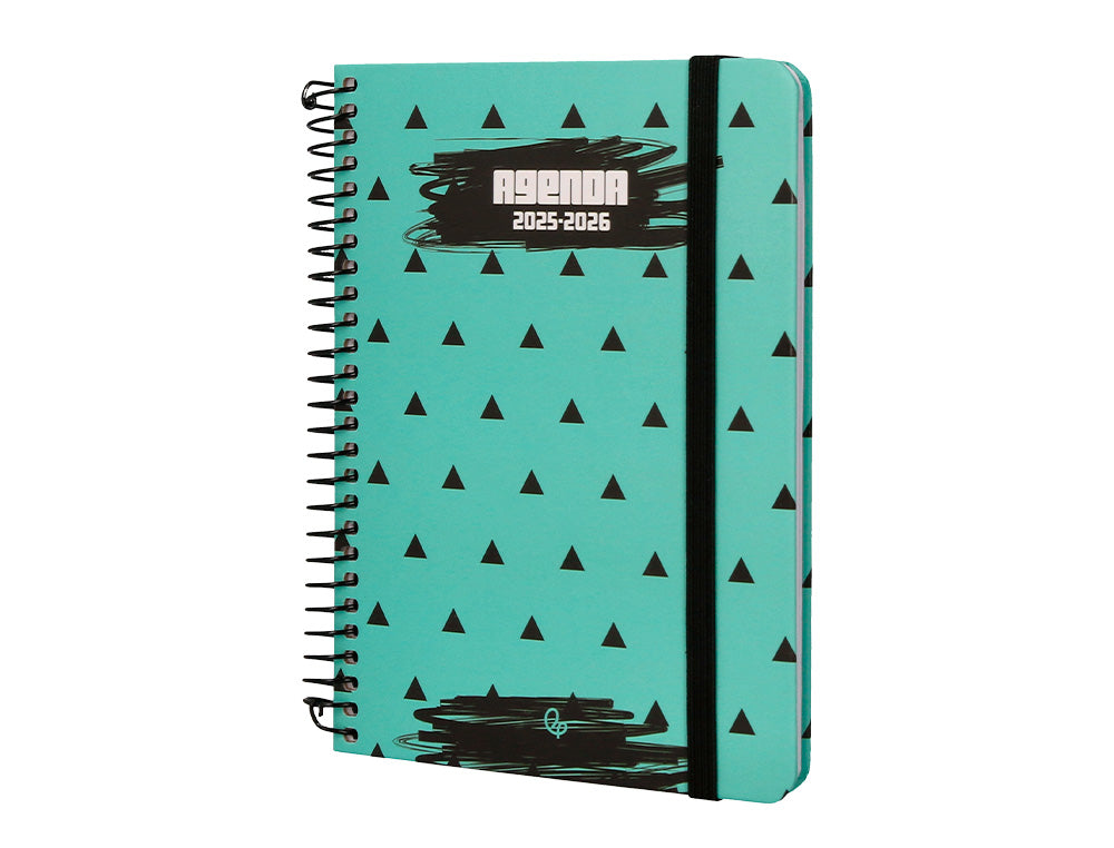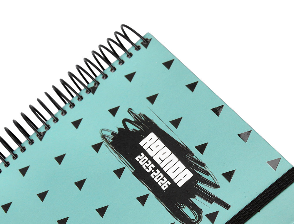 - Formato y Diseño: Encuadernación en espiral que permite un manejo fácil y que la agenda permanezca abierta y plana para una escritura cómoda. El elegante diseño Patterns Triángulos convierte la planificación en una experiencia visualmente atractiva.