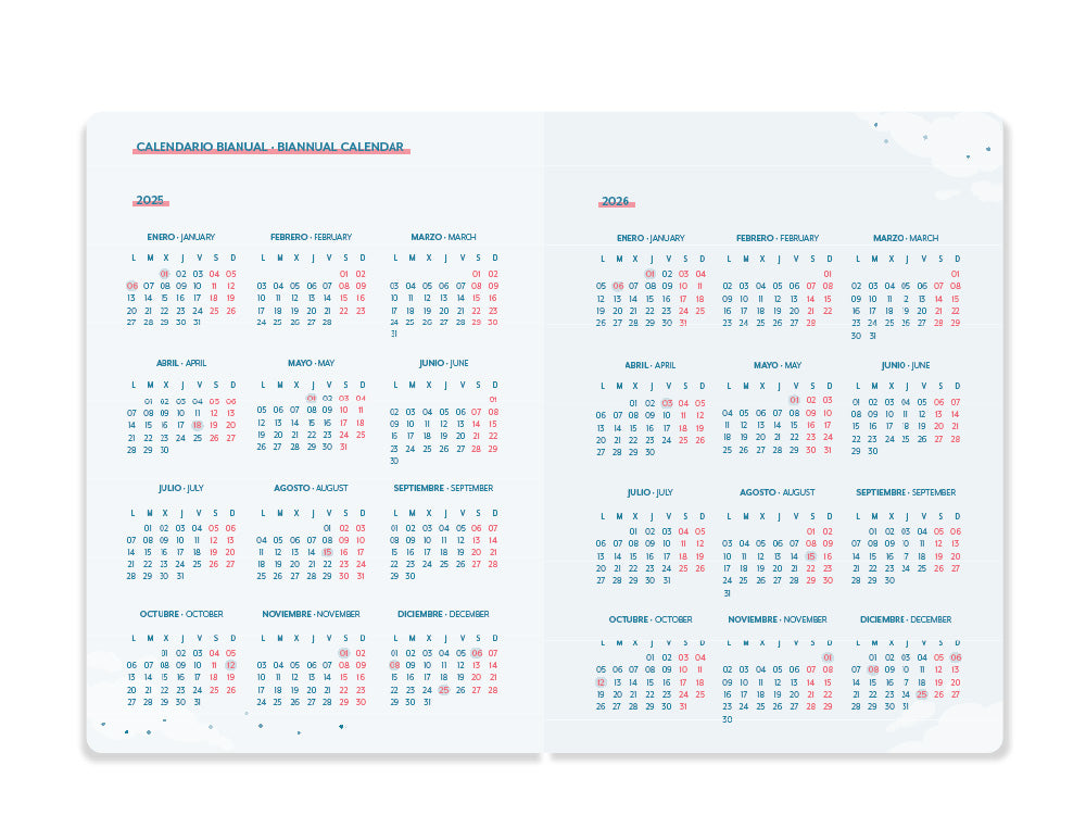 - Vista Semanal: Presenta toda la semana en un vistazo a dos páginas, ideal para planificar y organizar actividades rápidamente.