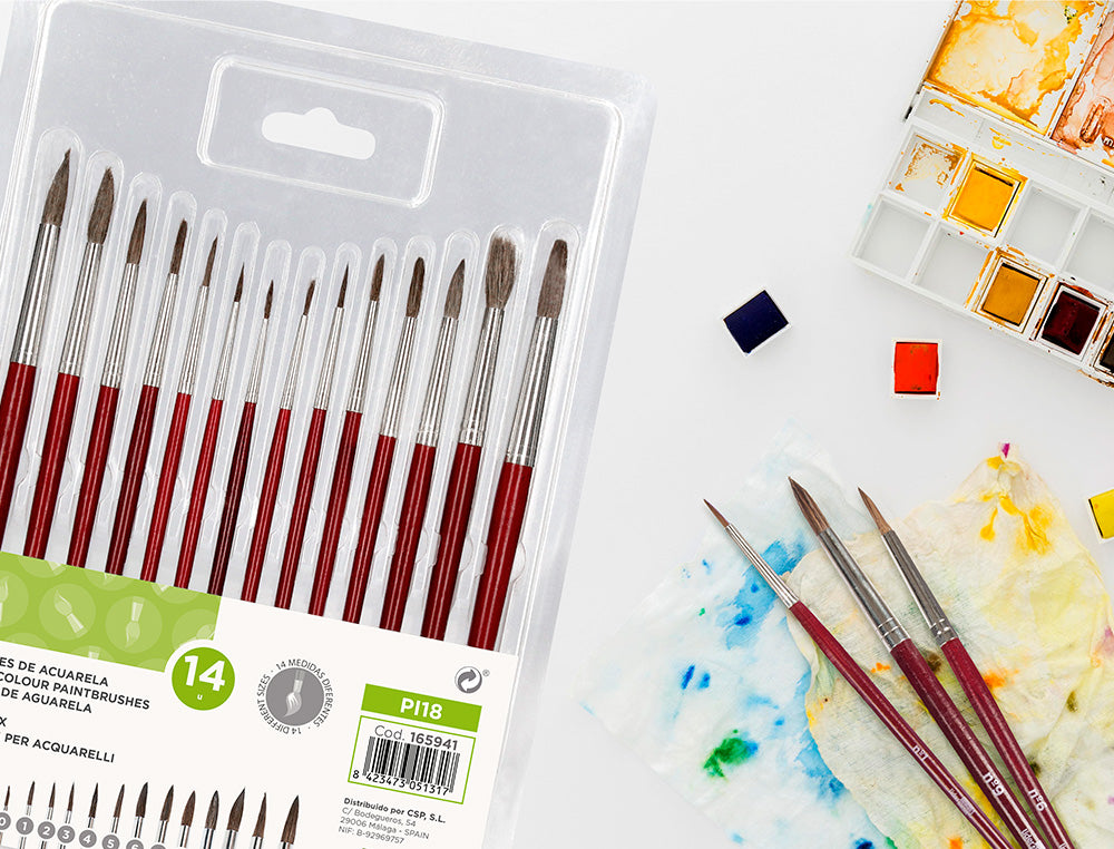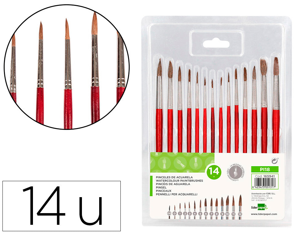Pinceles acuarela liderpapel virola cromada pelo engomado blister de 14 unidades surtidas