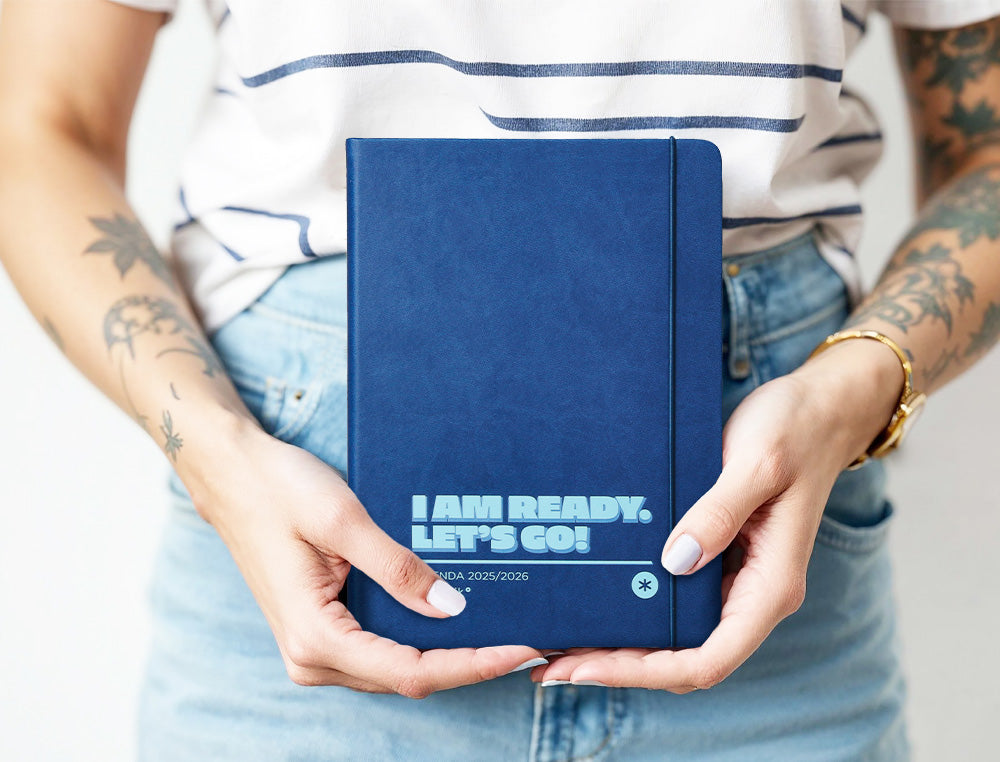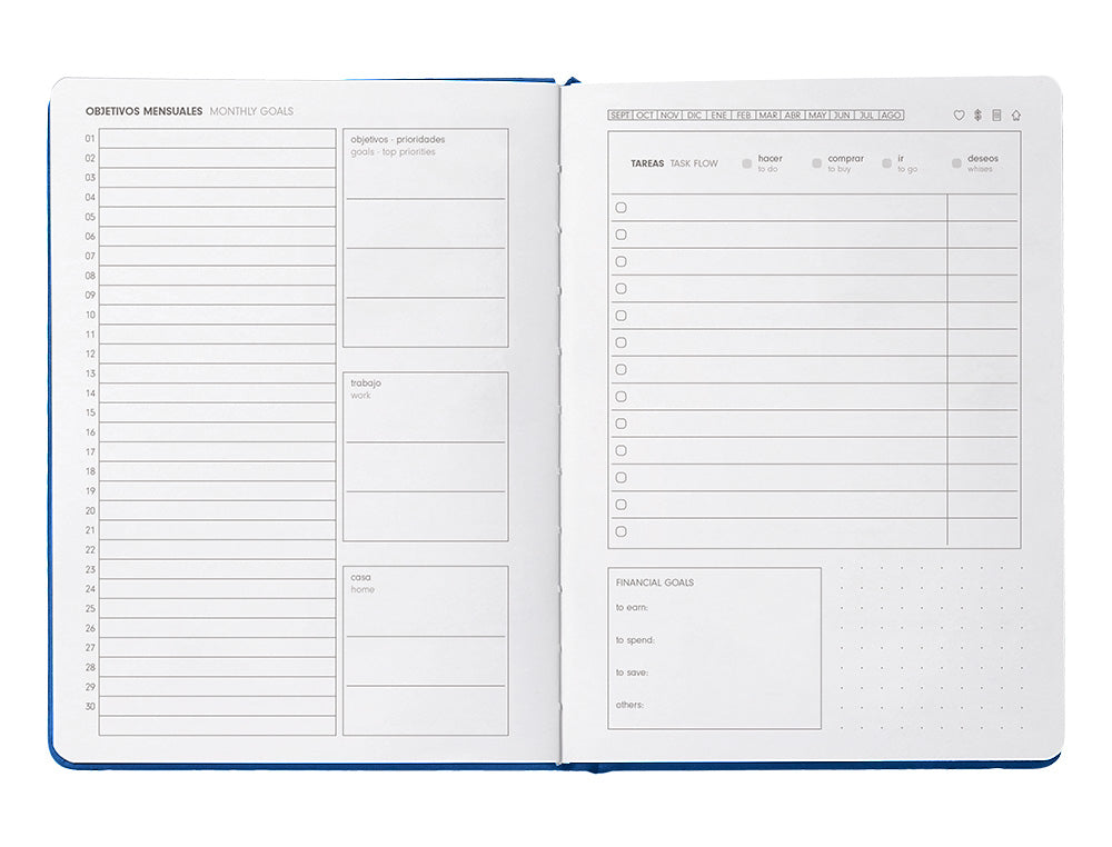 - Diseño y Encuadernación: Elegante y profesional con material que simula piel en color azul oscuro. Su tamaño A5 es perfecto para el día a día y fácil de llevar a cualquier parte.