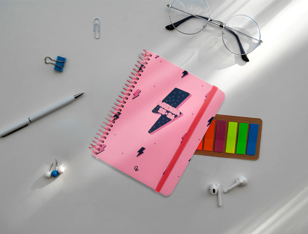 • Formato y Diseño: Compacta y portátil en formato A6, con un atractivo diseño de PATTERNS RAYOS ROSA.